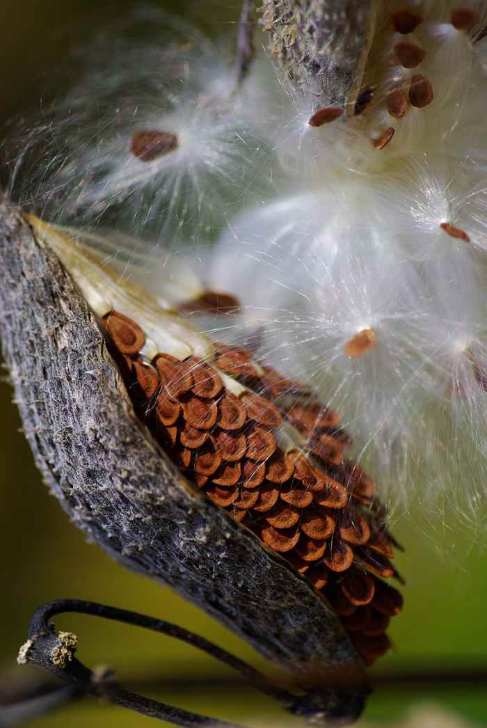 Milkweed seedpods contain silky fibers that act as parachutes for the seeds. These fibers have other uses as well. They are an effective insulation, have been used to help clean up oil spills and can be made into strong ropes.